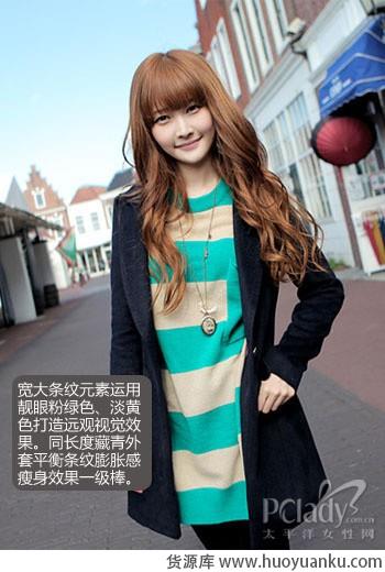 05 宽大条纹衫,运用粉绿色、淡黄色打造远观视觉效果。外搭同长度藏青外套,平衡了条纹膨胀感,瘦身效果一级棒。
